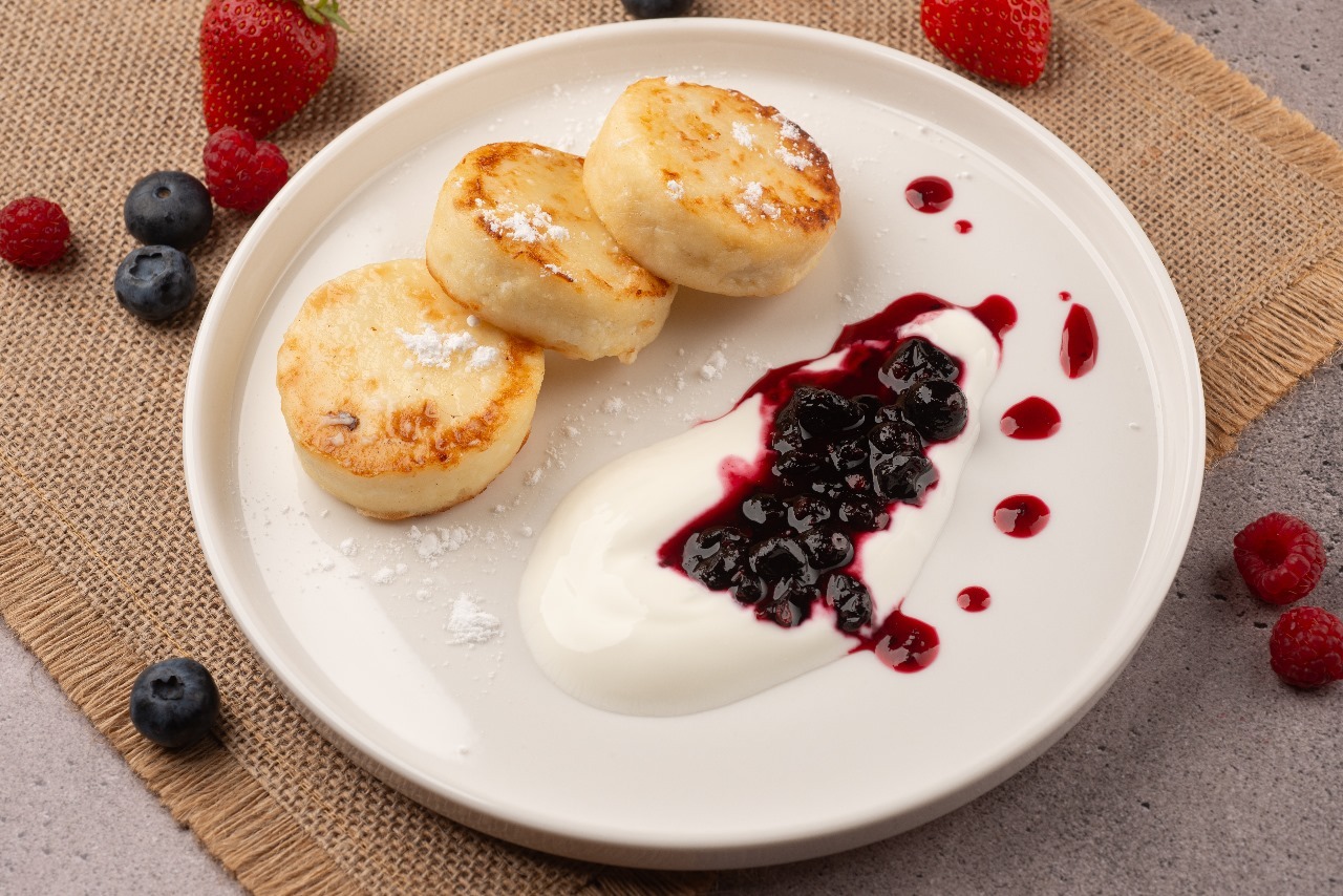 Сырники со сметаной и клубничным джемом - 319₽